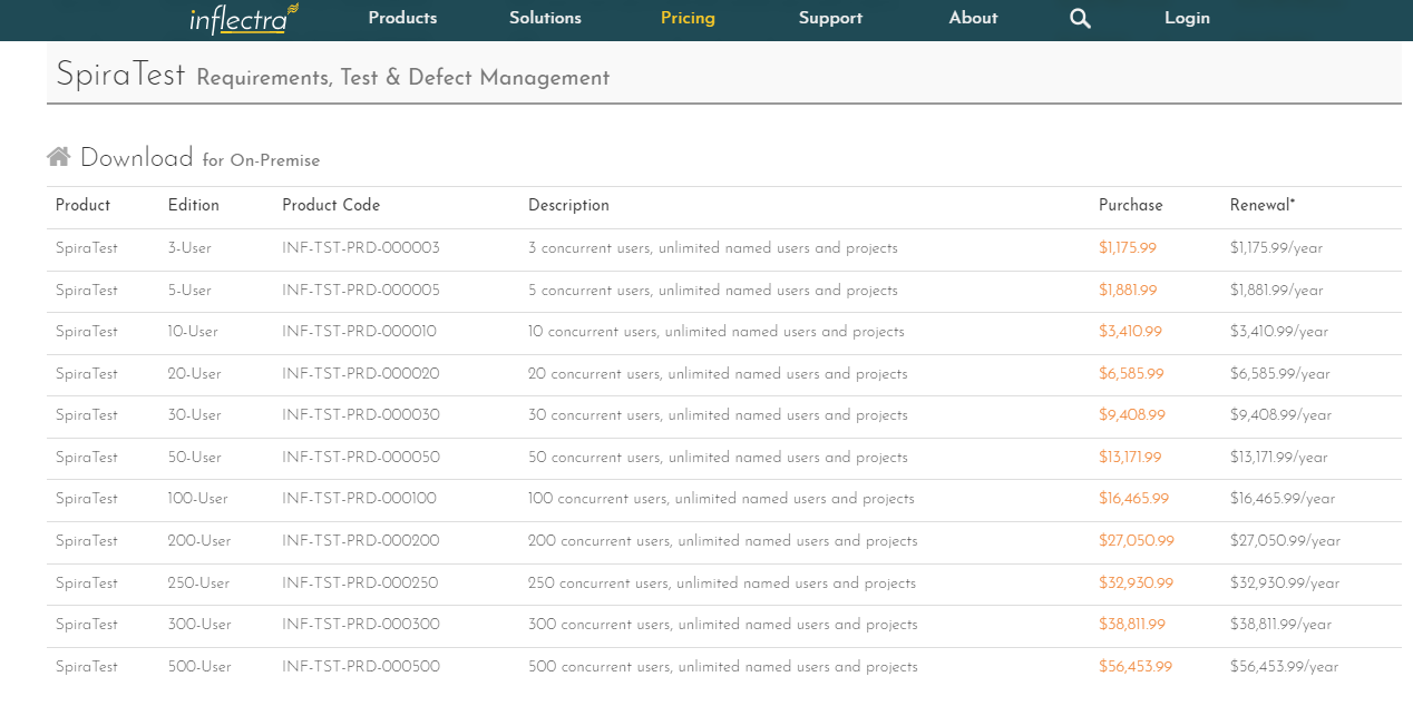 SpiraTest has different pricing plans depending on the number of users and whether it is cloud-based or on-premise. According to the search results, SpiraTest has 8 pricing editions ranging from $109.99 to $14,968.69.
