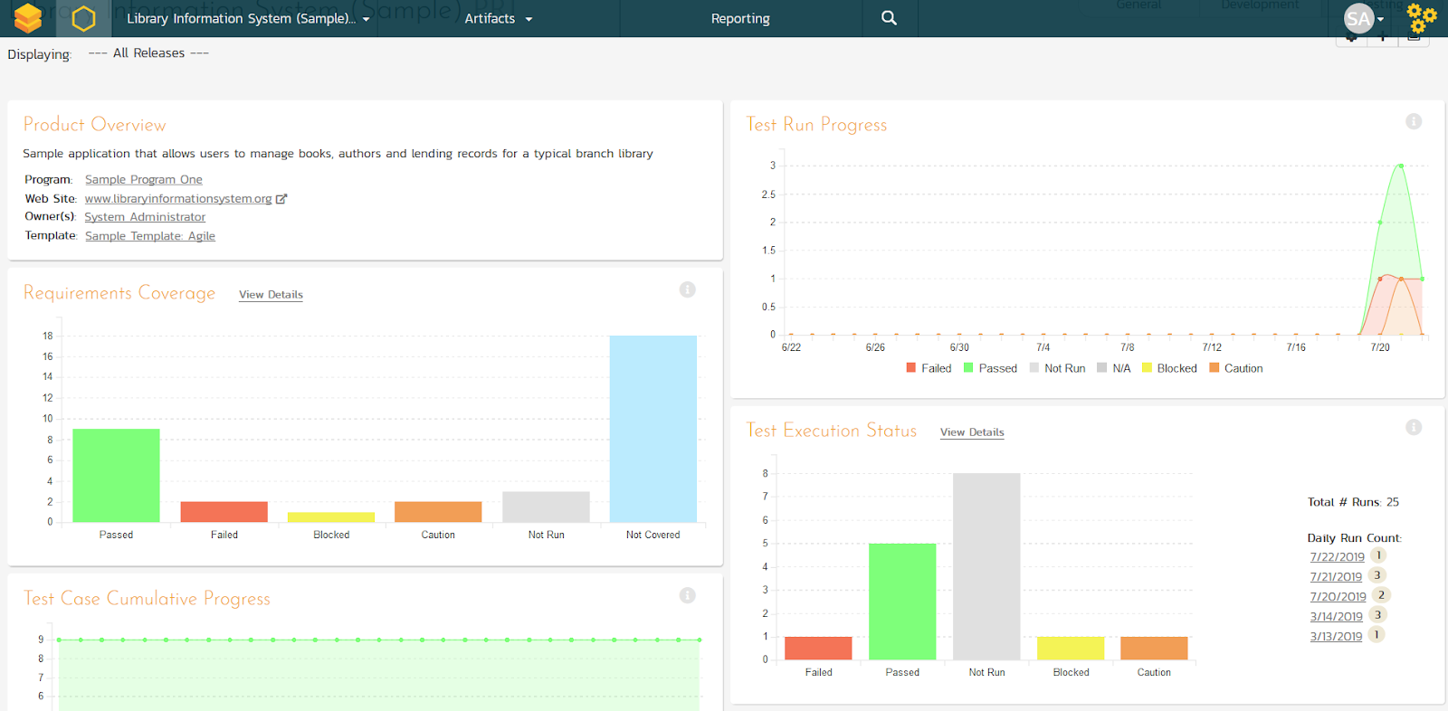 Spiratest tool offers robust reporting and organizational features that make managing and monitoring your projects easy. You can view the status of your project on a detailed and user-friendly dashboard. The dashboard displays all your project artifacts, so you can quickly see the health of your project at a glance.