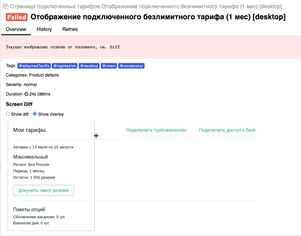 Screenshot testing became the icing on the cake. Playwright can take both full-page screenshots and screenshots of specific elements to be used for reference. Allure TestOps in turn has a convenient reference-result comparison interface.