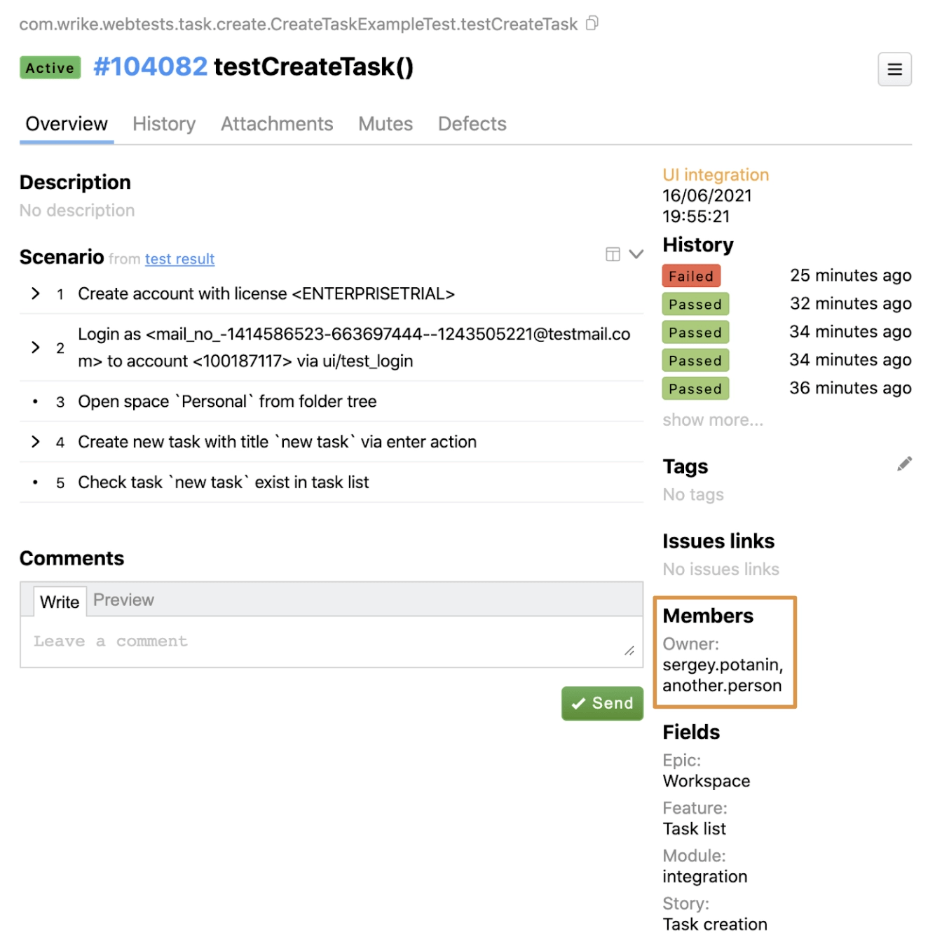In Allure’s main view of the test there’s a member section. It contains information about owners passed with the annotation I showed before.