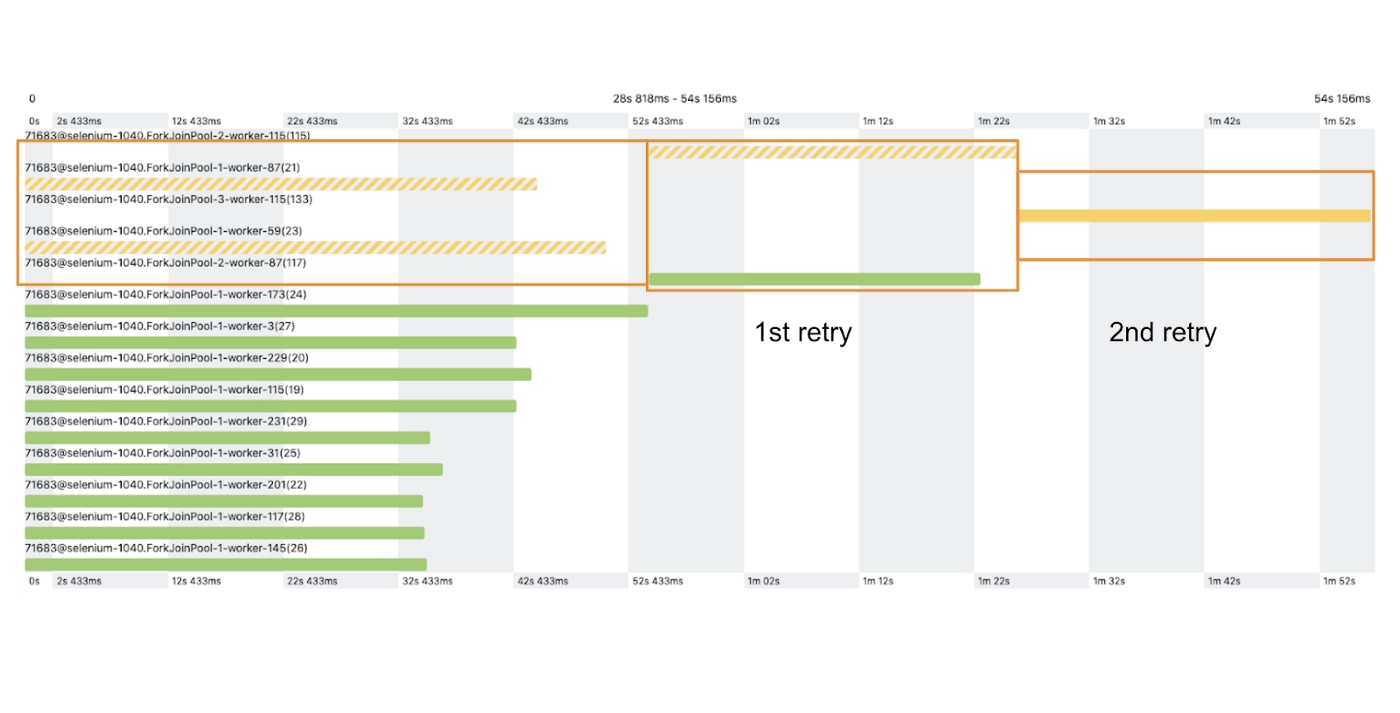 To increase test stability, we retry failed tests twice during the suite run. This picture shows how two particular tests were retried. At the first retry one of them passed, but another one failed again. On the second retry the test failed for the third time. It means that there must be a problem in the test. We then only have to deal with one failed test instead of two, which is nice.