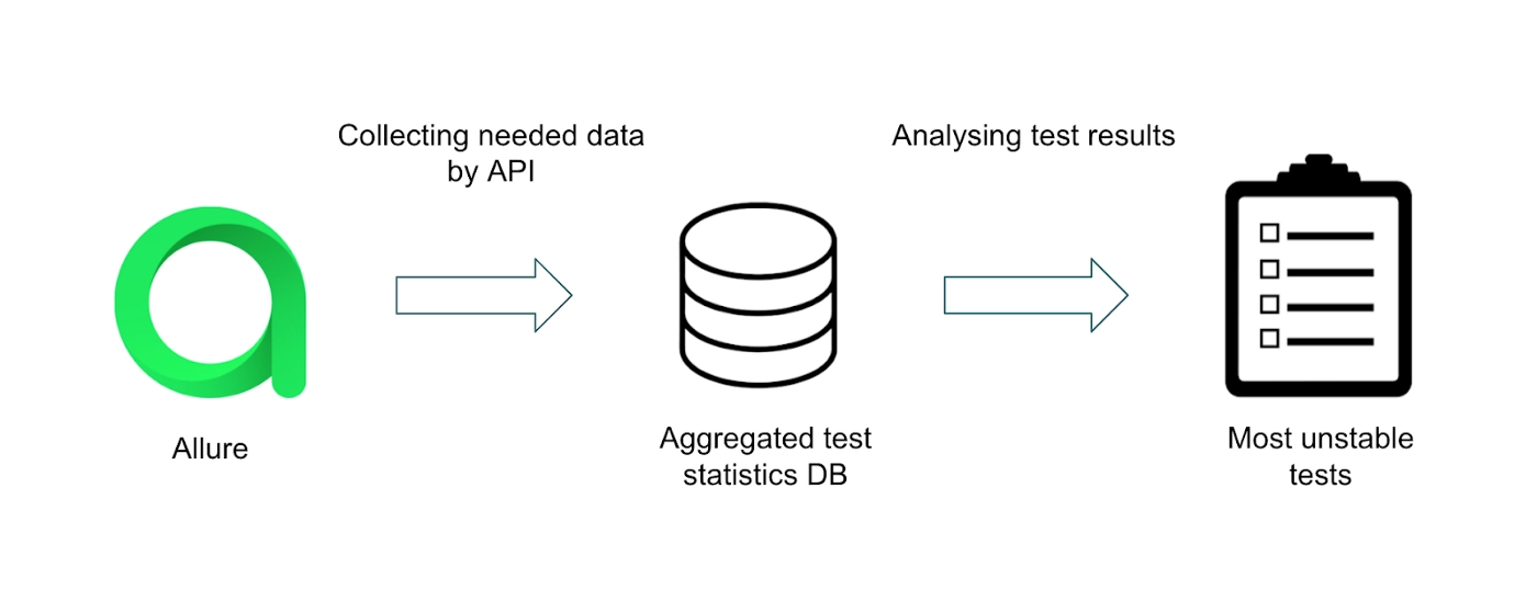 As Allure stores all the data for each test run, we first collect the needed data into a separate database. We do this to not overload Allure with too many analytics requests that we execute while analyzing the tests. In this analysis we consider test history, the stack traces of failures, the number of retries, and many more factors. As a result we have a list of the most unstable tests.