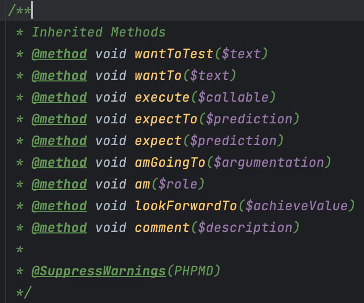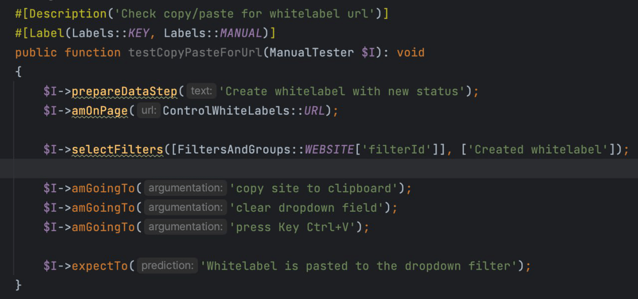 And for manual tests, we also use Inherited Methods, which are already implemented in Codeception, as well as the executeStep method from Allure.